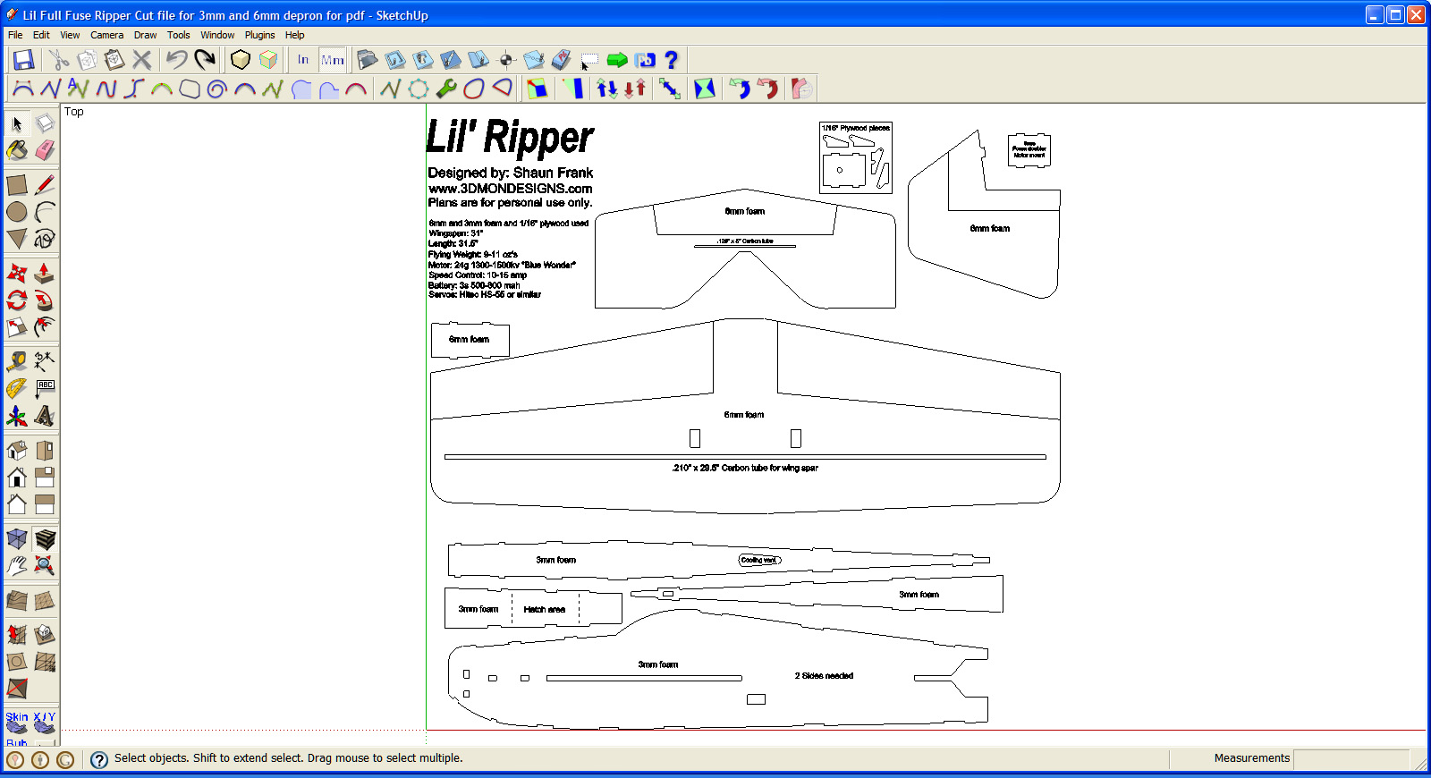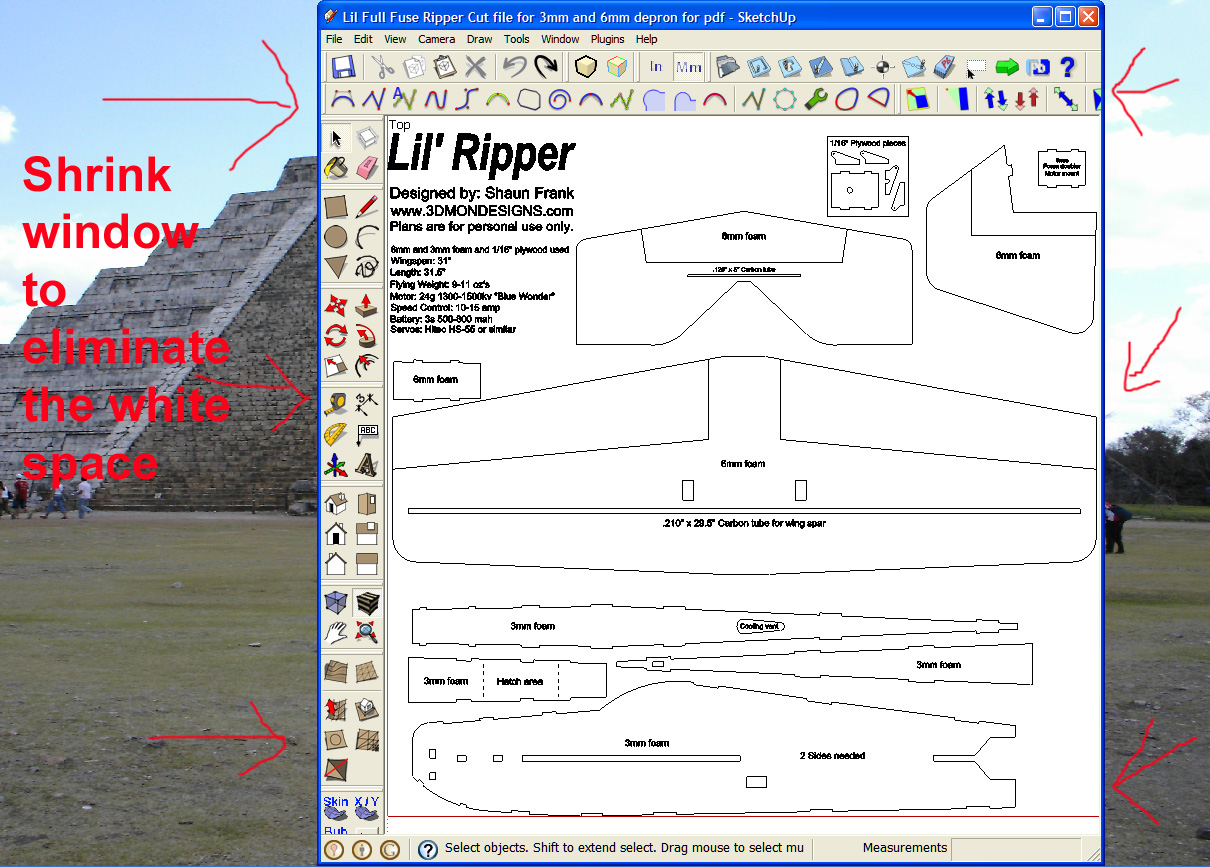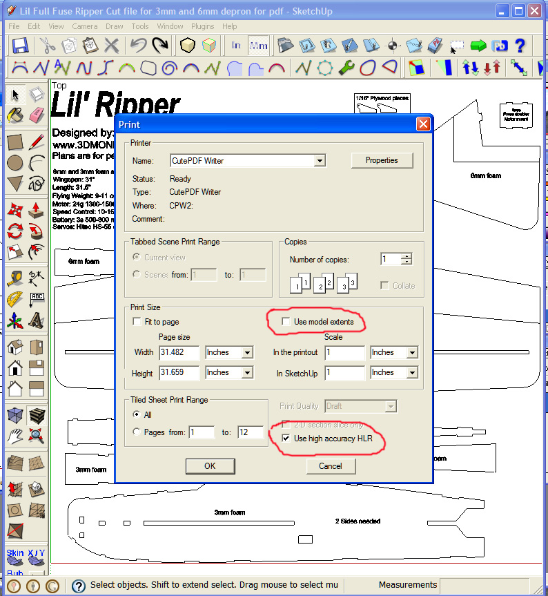 I have followed 3dmons tutorial on making a Pdf and everything works, accept I have one problem. The whole plan should fit on 3 or 4 prints, the fuselage is only 10 1/4", but no matter what I do it always comes up as 10 prints (a lot of wasted white space). I have even tried to make a print of just one component, when it prints, it splits it into two prints. Can someone help me figure out what I am doing wrong?